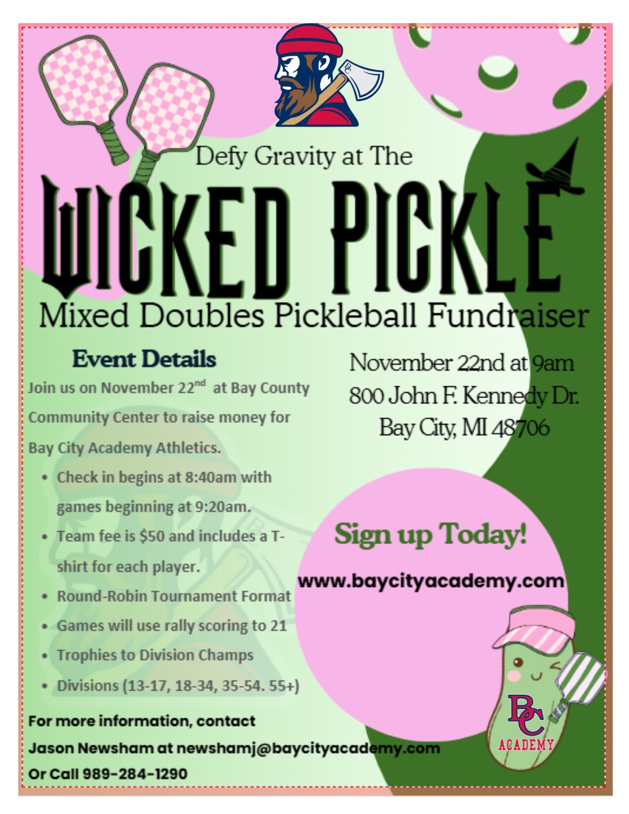 Join us in supporting Bay City Academy Athletics with a Mixed Doubles pickleball tournament on November 22nd! The first ever Wicked Pickle will be located at Bay County Community Center (800 John F. Kennedy Drive, Bay City, MI 48706) to raise money for Bay City Academy Athletics.