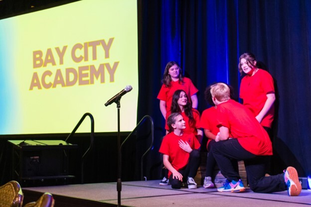 Bay City Academy offers a Music Theatre class built into our daily school schedule. In theatre class, students learn many performance techniques, including acting, singing, and dancing. Students can help with student directing, assistant directing, choreography, and set design during competition season.